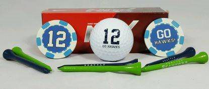 - 3 Pack of Nike NDX golf balls with the 12th man logo and "Go Hawks" imprinted on them